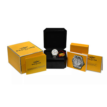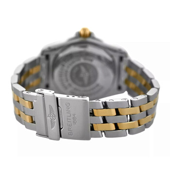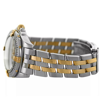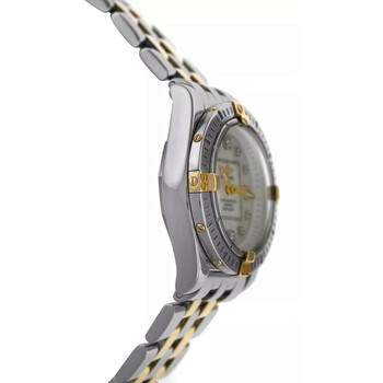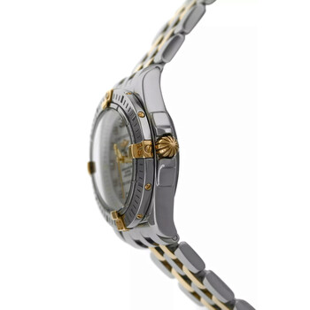 Silver-tone stainless steel case with a two-tone (silver-tone and yellow gold-tone) 18kt yellow gold and stainless steel bracelet. Uni-directional rotating silver-tone stainless steel bezel. Mother of pearl dial with yellow gold-tone hands and index hour markers. Minute scale around the inner rim. Dial Type: Analog. Luminescent hands. Date display at the 3 o'clock position. Breitling Calibre 71 quartz movement. Scratch resistant sapphire crystal. Pull / push crown. Solid case back. Round case shape, case size: 32 mm. Fold over clasp with a safety release. Water resistant at 100 meters / 330 feet. Functions: date, hour, minute, second, chronometer. Cockpit Lady Series. Casual watch style. Watch label: Swiss Made. Pre-owned Breitling Cockpit Lady Quartz Chronometer Ladies Watch B71356.
