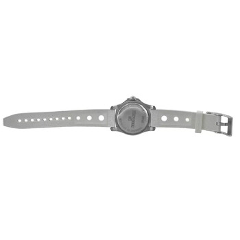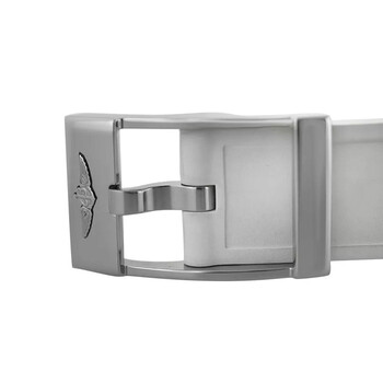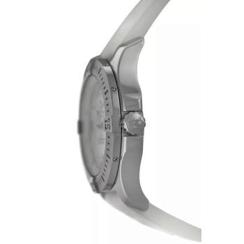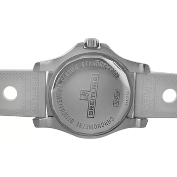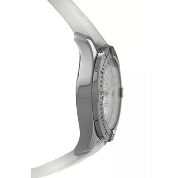 Silver-tone stainless steel case with a white rubber strap. Uni-directional rotating silver-tone stainless steel bezel. Mother of pearl dial with silver-tone hands and Arabic numeral & index hour markers. Minute markers around the outer rim. Dial Type: Analog. Luminescent hands. Date display at the 3 o'clock position. Breitling Calibre 74 quartz movement. Scratch resistant sapphire crystal. Screw down crown. Solid case back. Round case shape, case size: 36 mm. Buckle clasp. Water resistant at 200 meters / 660 feet. Functions: date, hour, minute, second, chronometer. Colt Series. Luxury watch style. Watch label: Swiss Made. Pre-owned Breitling Colt Quartz Chronometer Ladies Watch A74389.