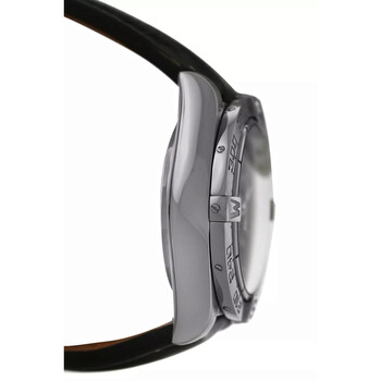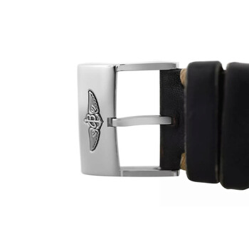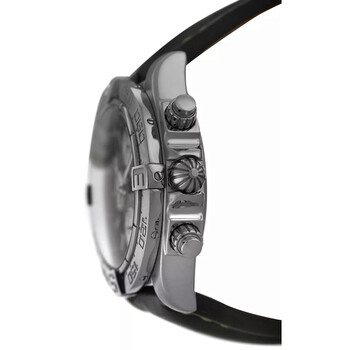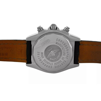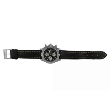 Silver-tone stainless steel case with a black leather strap. Bi-directional rotating silver-tone stainless steel bezel. Black dial with silver-tone hands and Arabic numeral & index hour markers. Minute markers around the outer rim. Dial Type: Analog. Luminescent hands and markers. Date display at the 3 o'clock position. Chronograph - three sub-dials displaying: 60 second, 30 minute and 12 hour. Breitling Calibre 13 Automatic movement, based upon ETA Valjoux 7750, containing 25 Jewels, bitting at 28800 vph, and has a power reserve of approximately 42 hours. Scratch resistant sapphire crystal. Screw down crown. Solid case back. Round case shape, case size: 44 mm. Buckle clasp. Water resistant at 300 meters / 1000 feet. Functions: chronograph, date, hour, minute, second, chronometer. Galactic A13364 Series. Dive watch style. Watch label: Swiss Made. Pre-owned Breitling Galactic A13364 Chronograph Automatic Chronometer Black Dial Men's Watch A13364.
