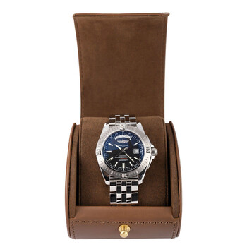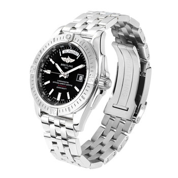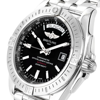 Silver-tone stainless steel case and bracelet. Uni-directional rotating silver-tone stainless steel bezel. Black dial with silver-tone hands and index hour markers. Minute markers around the outer rim. Dial Type: Analog. Luminescent hands and markers. Date display at the 3 o'clock position. Breitling Calibre 45 Automatic movement, based upon ETA 2834-2, containing 25 Jewels, bitting at 28800 vph, and has a power reserve of approximately 42 hours. Scratch resistant sapphire crystal. Screw down crown. Solid case back. Round case shape, case size: 44 mm. Fold over clasp with a safety release. Water resistant at 200 meters / 660 feet. Functions: date, day, hour, minute, second, chronometer. Galactic Series. Luxury watch style. Watch label: Swiss Made. Pre-owned Breitling Galactic Automatic Chronometer Black Dial Men's Watch A453201A/BG10.