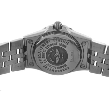 Silver-tone stainless steel case and bracelet. Fixed silver-tone bezel with diamond set stainless steel. White dial with silver-tone hands and Arabic numeral hour markers. Minute markers around the outer rim. Dial Type: Analog. Luminescent hands. Date display at the 3 o'clock position. Breitling Calibre 71 quartz movement. Solid case back. Round case shape, case size: 30 mm. Fold over clasp with a safety release. Water resistant at 100 meters / 330 feet. Functions: date, hour, minute, second, chronometer. Galactic Series. Fashion watch style. Watch label: Swiss Made. Pre-owned Breitling Galactic Quartz Chronometer Diamond White Dial Ladies Watch A71340.