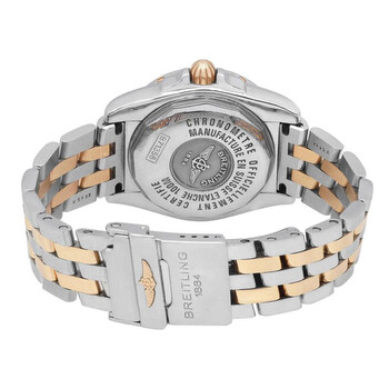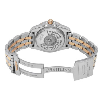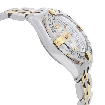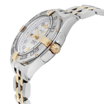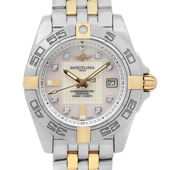 Silver-tone stainless steel case with a two-tone (silver-tone and yellow gold-tone) stainless steel bracelet. Uni-directional rotating silver-tone stainless steel bezel. White dial with yellow gold-tone hands and diamond hour markers. Minute markers around the outer rim. Dial Type: Analog. Luminescent hands. Date display at the 3 o'clock position. Breitling Calibre 71 quartz movement. Scratch resistant sapphire crystal. Pull / push crown. Solid case back. Round case shape, case size: 31 mm, case thickness: 13 mm. Band width: 14 mm, band length: 6.25 inches. Fold over clasp with a safety release. Water resistant at 100 meters / 330 feet. Functions: date, hour, minute, second, chronometer. Galactic Series. Luxury watch style. Watch label: Swiss Made. Pre-owned Breitling Galactic Quartz Chronometer Diamond White Dial Ladies Watch B71356L2/A710-367D.