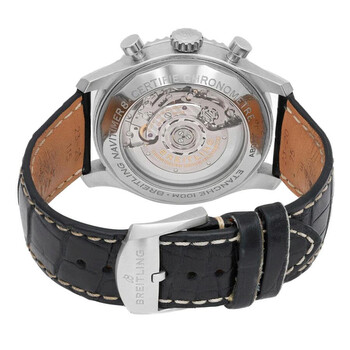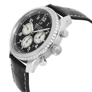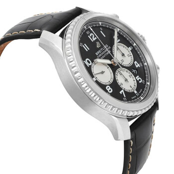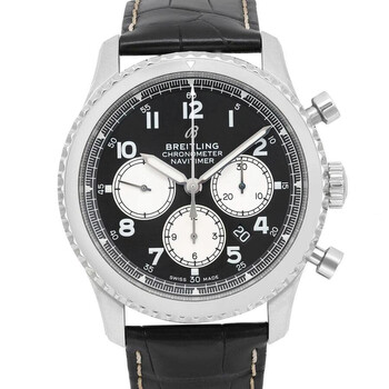 Grey stainless steel case with a black leather strap. Bi-directional rotating grey stainless steel bezel. Black dial with silver-tone hands and Arabic numeral hour markers. Minute markers around the outer rim. Dial Type: Analog. Luminescent hands and markers. Date display between 4 and 5 o'clock position. Chronograph - three sub-dials displaying: 60 second, 30 minute and 12 hour. Breitling Calibre 01 Automatic movement, containing 47 Jewels, composed of 346 parts, bitting at 28800 vph, and has a power reserve of approximately 70 hours. Scratch resistant sapphire crystal. Pull / push crown. Transparent case back. Round case shape, case size: 43 mm, case thickness: 14 mm. Band width: 19 mm, band length: 8 inches. Buckle clasp. Water resistant at 100 meters / 330 feet. Functions: chronograph, column wheel, date, hour, minute, second, chronometer. Navitimer 8 Series. Luxury watch style. Watch label: Swiss Made. Pre-owned Breitling Navitimer 8 Chronograph Automatic Chronometer Black Dial Men's Watch AB0117131B1A1.