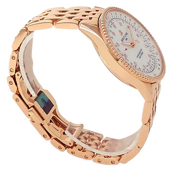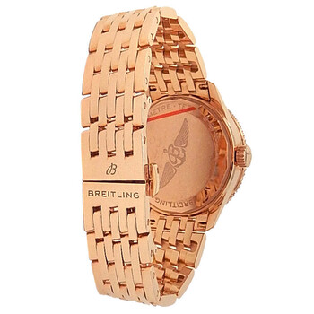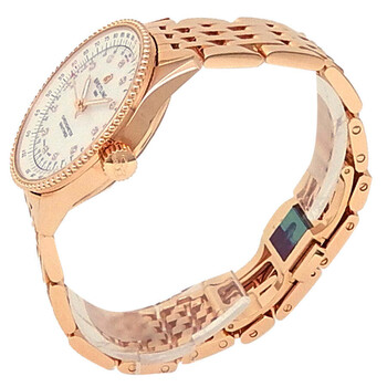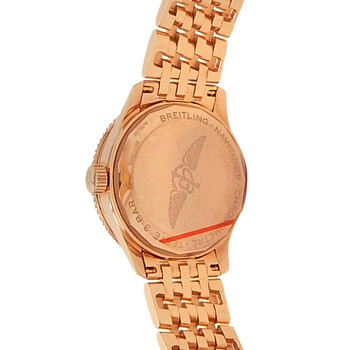 Rose gold-tone 18kt rose gold case and bracelet. Bi-directional rotating rose gold-tone 18kt rose gold bezel. Mother of pearl dial with rose gold-tone hands and diamond hour markers. Minute markers around the outer rim. Dial Type: Analog. Breitling Calibre 17 Automatic movement, based upon ETA 2824-2, containing 25 Jewels, bitting at 28800 vph, and has a power reserve of approximately 42 hours. Scratch resistant sapphire crystal. Screw down crown. Solid case back. Round case shape, case size: 35 mm. Fold over clasp with a safety release. Water resistant at 30 meters / 100 feet. Functions: hour, minute, second, chronometer. Navitimer Series. Dress watch style. Watch label: Swiss Made. Pre-owned Breitling Navitimer Automatic Chronometer Diamond Men's Watch R17395211A1R1.