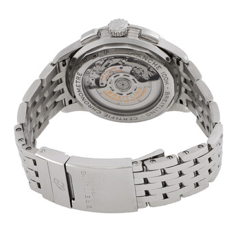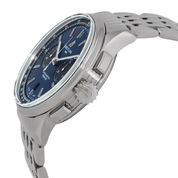 Silver-tone stainless steel case and bracelet. Fixed silver-tone stainless steel bezel. Blue dial with luminous silver-tone hands and index hour markers. Minute markers. Tachymeter markings around the outer rim. Dial Type: Analog. Luminescent hands and markers. Date display at the 6 o'clock position. Chronograph - two sub-dials displaying: 60 second and 30 minute. Breitling Calibre 01 Automatic movement, containing 47 Jewels, composed of 346 parts, bitting at 28800 vph, and has a power reserve of approximately 70 hours. Scratch resistant sapphire crystal. Pull / push crown. Transparent case back. Round case shape, case size: 42 mm, case thickness: 13.65 mm. Band width: 22 mm. Deployment with push button release clasp. Water resistant at 100 meters / 330 feet. Functions: chronograph, column wheel, date, hour, minute, second, chronometer. Premier Series. Luxury watch style. Watch label: Swiss Made. Pre-owned Breitling Premier Chronograph Automatic Chronometer Blue Dial Men's Watch AB0118A61C1A1.