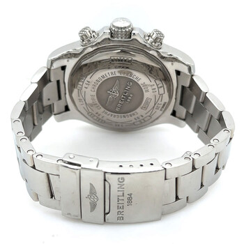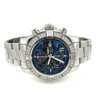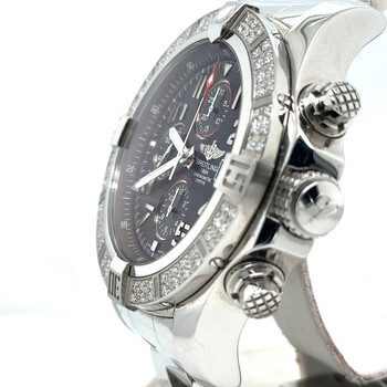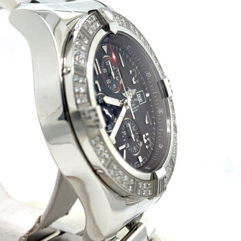 Silver-tone stainless steel case and bracelet. Fixed silver-tone bezel with diamond set stainless steel. Black dial with silver-tone hands and Arabic numeral hour markers. Minute markers around the outer rim. Dial Type: Analog. Luminescent hands and markers. Date display at the 3 o'clock position. Chronograph - three sub-dials displaying: 60 second, 30 minute and 12 hour. Breitling Calibre 13 Automatic movement, based upon ETA Valjoux 7750, containing 25 Jewels, bitting at 28800 vph, and has a power reserve of approximately 42 hours. Scratch resistant sapphire crystal. Screw down crown. Solid case back. Round case shape, case size: 48 mm, case thickness: 17 mm. Band width: 24 mm. Fold over clasp with a safety release. Water resistant at 300 meters / 1000 feet. Functions: chronograph, date, hour, minute, second, chronometer. Super Avenger II Series. Luxury watch style. Watch label: Swiss Made. Pre-owned Breitling Super Avenger Ii Chronograph Automatic Chronometer Diamond Black Dial Men's Watch A1337153/BC28-168A.