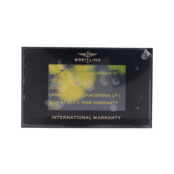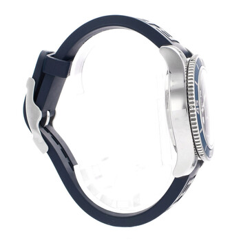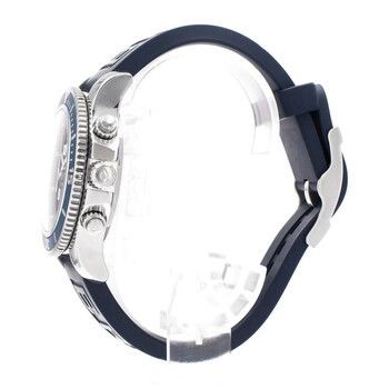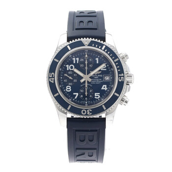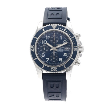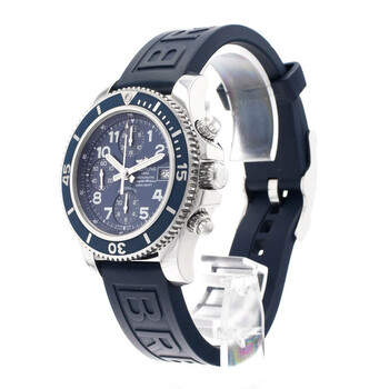 Silver-tone stainless steel case with a blue rubber strap. Uni-directional rotating blue stainless steel bezel. Blue dial with silver-tone hands and Arabic numeral hour markers. Minute markers around the outer rim. Dial Type: Analog. Luminescent hands and markers. Date display at the 3 o'clock position. Chronograph - three sub-dials displaying: 60 second, 30 minute and 12 hour. Breitling Calibre 13 Automatic movement, based upon ETA Valjoux 7750, containing 25 Jewels, bitting at 28800 vph, and has a power reserve of approximately 42 hours. Scratch resistant sapphire crystal. Screw down crown. Solid case back. Round case shape, case size: 42 mm. Buckle clasp. Water resistant at 200 meters / 660 feet. Functions: chronograph, date, hour, minute, second, chronometer. Superocean Series. Luxury watch style. Watch label: Swiss Made. Pre-owned Breitling Superocean Chronograph Automatic Chronometer Blue Dial Men's Watch A13311.