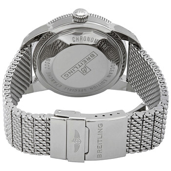 Silver-tone stainless steel case with a silver-tone stainless steel mesh bracelet. Uni-directional rotating silver-tone stainless steel with a black ceramic top ring bezel. Black dial with luminous silver-tone hands and index hour markers. Minute markers around the outer rim. Dial Type: Analog. Luminescent hands and markers. Date display at the 6 o'clock position. Breitling Calibre B20 Automatic movement, based upon Tudor MT5612, containing 28 Jewels, bitting at 28800 vph, and has a power reserve of approximately 70 hours. Scratch resistant sapphire crystal. Screw down crown. Solid case back. Round case shape, case size: 46 mm, case thickness: 15 mm. Band width: 24 mm /20 mm, band length: 7 1/4 inches. Fold over clasp. Water resistant at 200 meters / 660 feet. Functions: date, hour, minute, second. Superocean Heritage II Series. Luxury watch style. Watch label: Swiss Made. Pre-owned Breitling Superocean Heritage II Automatic Black Dial Men's Watch AB2020121B1A1.