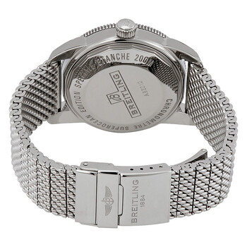 Silver-tone stainless steel case with a silver-tone stainless steel mesh bracelet. Uni-directional rotating silver-tone stainless steel with a bronze ceramic top ring bezel. Bronze dial with luminous silver-tone hands and index hour markers. Minute markers around the outer rim. Dial Type: Analog. Luminescent hands and markers. Date display at the 6 o'clock position. Breitling Calibre B20 Automatic movement, based upon Tudor MT5612, containing 28 Jewels, bitting at 28800 vph, and has a power reserve of approximately 70 hours. Scratch resistant sapphire crystal. Screw down crown. Solid case back. Round case shape, case size: 42 mm, case thickness: 14.35 mm. Band width: 22 mm, band length: 7 1/4 inches. Fold over clasp with a push button release. Water resistant at 200 meters / 660 feet. Functions: date, hour, minute, second. Superocean Heritage II Series. Casual watch style. Watch label: Swiss Made. Pre-owned Breitling Superocean Heritage II Automatic Men's Watch AB201033/Q617-154A.