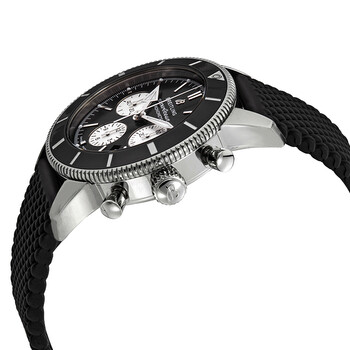 Pre-owned Stainless steel case with a black rubber strap. Uni-directional rotating stainless steel bezsel with a black ceramic top ring. Black dial with luminous silver-tone arrow-shaped hands and index hour markers. Minute markers around the outer rim. Dial Type: Analog. Luminescent hands and markers. Date display between the 4 and 5 o'clock positions. Chronograph - three silver sub-dials displaying: 60 second, 30 minute and 12 hour. Breitling calibre 01 automatic movement, containing 47 Jewels, composed of 346 parts, bitting at 28800 vph, and has a power reserve of approximately 70 hours. Scratch resistant sapphire crystal. Screw locked crown. Transparent case back. Round case shape. Case size: 44 mm. Case thickness: 15.50 mm. Band width: 22 mm. Fold over clasp with a push button release. Water resistant at 200 meters / 660 feet. Functions: chronograph, column wheel, date, hour, minute, second, chronometer. Luxury watch style. Watch label: Swiss Made. Item Variations: AB016212-BG82-279S-A20D.4. Breitling Superocean Heritage II Chronograph Automatic Chronometer Black Dial Men's Watch AB0162121B1S1.
