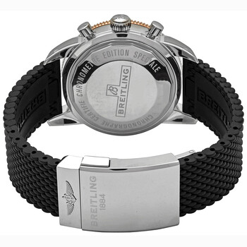 Silver-tone stainless steel case with a black rubber strap. Uni-directional rotating 18kt rose gold and black ceramic bezel. Black dial with luminous rose gold arrow-shaped hands and index hour markers. Minute markers around the outer rim. Dial Type: Analog. Luminescent hands and markers. Date display at the 3 o'clock position. Chronograph - three sub-dials displaying: 60 second, 30 minute and 12 hour. Breitling Calibre 13 Automatic movement, based upon ETA Valjoux 7750, containing 25 Jewels, bitting at 28800 vph, and has a power reserve of approximately 42 hours. Scratch resistant sapphire crystal. Screw locked crown. Solid case back. Round case shape, case size: 44 mm, case thickness: 15.65 mm. Band width: 22 mm. Fold over with a push button release clasp. Water resistant at 200 meters / 660 feet. Functions: chronograph, date, hour, minute, second, chronometer. Superocean Heritage II Series. Luxury watch style. Watch label: Swiss Made. Pre-owned Breitling Superocean Heritage II Chronograph Automatic Chronometer Black Dial Men's Watch U13313121B1S1.