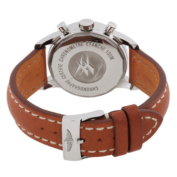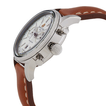 Silver-tone stainless steel case with a brown leather strap. Fixed silver-tone stainless steel bezel. Silver dial with silver-tone hands and index hour markers. Minute markers around the outer rim. Dial Type: Analog. Luminescent hands and markers. Date display 6 o'clock position. Chronograph - two sub-dials displaying: 60 second and 30 minute. Automatic movement. Scratch resistant sapphire crystal. Screw down crown. Solid case back. Round case shape, case size: 38 mm. Buckle clasp. Water resistant at 100 meters / 330 feet. Functions: chronograph, date, hour, minute, second, tachymeter. Casual, Sport watch style. Watch label: Swiss Made. Pre-owned Breitling Watch A4131012G757.