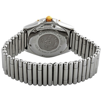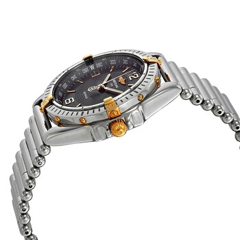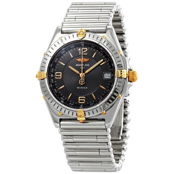 Silver-tone stainless steel case with a silver-tone stainless steel bracelet. Uni-directional rotating silver-tone stainless steel bezel. Black dial with gold-tone hands and Roman numeral and index hour markers. Minute markers around the outer rim. Dial Type: Analog. Date display at the 3 o'clock position. Breitling Calibre 10 automatic movement. Scratch resistant sapphire crystal. Pull / push crown. Solid case back. Round case shape, case size: 38 mm, case thickness: 13 mm. Hidden clasp. Water resistant at 100 meters / 330 feet. Functions: date, hour, minute, second. Watch label: Swiss Made. Pre-owned Breitling Windrider Automatic Black Dial Men's Watch A10050.