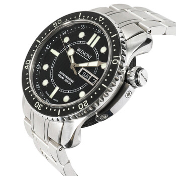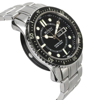 Silver-tone stainless steel case and bracelet. Black stainless steel bezel. Black dial with silver-tone hands and index hour markers. Minute scale around the inner rim. Dial Type: Analog. Luminescent hands and markers. Day of the week and date display at the 3 o'clock position. Automatic movement. Scratch resistant sapphire crystal. Screw down crown. Solid case back. Round case shape, case size: 43 mm, case thickness: 16 mm. Band length: 7.50 inches. Deployment with push button release clasp. Water resistant at 500 meters / 1650 feet. Functions: date, day, hour, minute, second. Supermarine Series. Dive watch style. Watch label: Swiss Made. Pre-owned Bremont Supermarine Automatic Black Dial Men's Watch S500/BK.