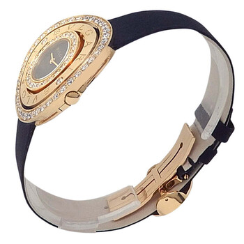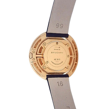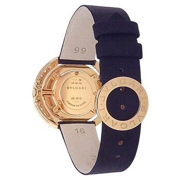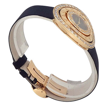 Rose gold-tone 18kt rose gold case with a black leather strap. Fixed rose gold-tone bezel with diamond set 18kt rose gold. Black dial with rose gold-tone hands. Dial Type: Analog. Quartz movement. Solid case back. Round case shape, case size: 36 mm. Fold over clasp with a safety release. Functions: hour, minute. Astrale Series. Dress watch style. Watch label: Swiss Made. Pre-owned Bvlgari Astrale Quartz Diamond Black Dial Ladies Watch AE 36 G.