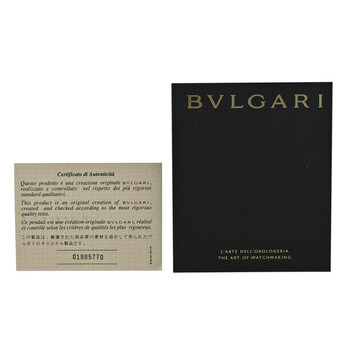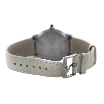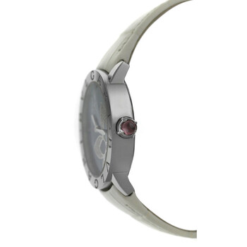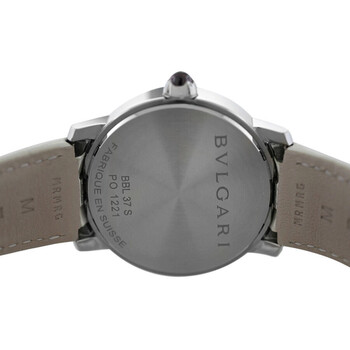 Silver-tone stainless steel case with a white leather strap. Fixed silver-tone stainless steel bezel. Blue dial with silver-tone hands. Dial Type: Analog. Automatic movement. Scratch resistant sapphire crystal. Cabochon crown. Solid case back. Round case shape, case size: 37 mm. Band length: 7 inches. Buckle clasp. Water resistant at 30 meters / 100 feet. Functions: hour, minute. Bvlgari Series. Luxury watch style. Watch label: Swiss Made. Item Variations: BBLP37S, BBL37FDSL. Pre-owned Bvlgari Bvlgari Automatic Blue Dial Ladies Watch 101897.