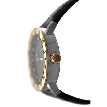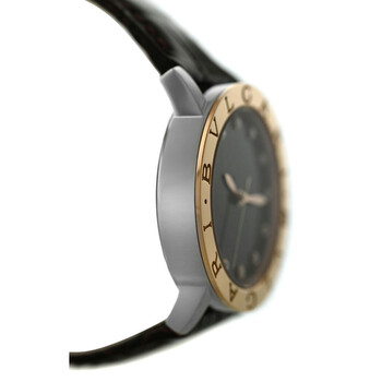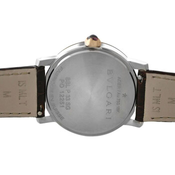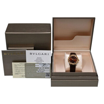 Silver-tone stainless steel case with a black leather strap. Fixed rose gold-tone 18kt rose gold bezel. Brown dial with rose gold-tone hands and diamond hour markers. Dial Type: Analog. Automatic movement. Scratch resistant sapphire crystal. Solid case back. Round case shape, case size: 33 mm. Band length: 6.75 inches. Buckle clasp. Water resistant at 30 meters / 100 feet. Functions: hour, minute, second. Bvlgari Series. Luxury watch style. Watch label: Swiss Made. Item Variations: BBLP33SG. Pre-owned Bvlgari Bvlgari Automatic Diamond Brown Dial Ladies Watch 102742.