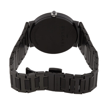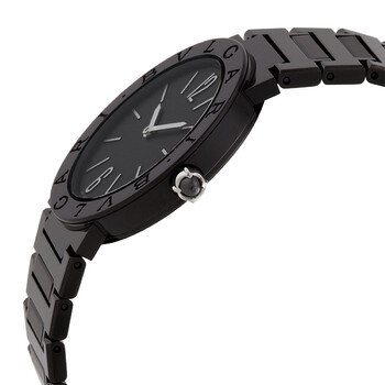 Black stainless steel case and bracelet. Fixed black bezel. Black dial with silver-tone hands and Arabic numeral hour markers. Dial Type: Analog. Bvlgari Calibre B043 quartz movement. Scratch resistant sapphire crystal. Pull / push crown. Round case shape, case size: 33 mm. Fold over clasp with a safety release. Water resistant at 30 meters / 100 feet. Functions: hour, minute. Bvlgari Series. Luxury watch style. Watch label: Swiss Made. Pre-owned Bvlgari Bvlgari Black Dial Ladies Watch 103557.