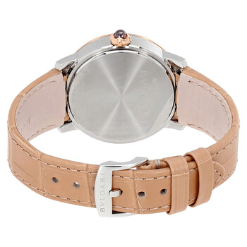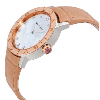Pre-owned Stainless steel case with a beige alligator leather strap. Fixed 18kt pink gold BVLGARI engraved bezel. White mother of pearl dial with polished steel hands and diamond hour markers. Dial Type: Analog. Automatic movement with a 42-hour power reserve. Scratch resistant sapphire crystal. Solid case back. Case diameter: 33 mm. Round case shape. Tang clasp. Water resistant at 30 meters / 100 feet. Functions: hour, minute, second. Luxury watch style. Watch label: Swiss Made. Item Variations: BBL33WSPGL/12. Bvlgari BVLGARI White Mother of Pearl Diamond Dial 33mm Automatic Ladies Watch 101893.