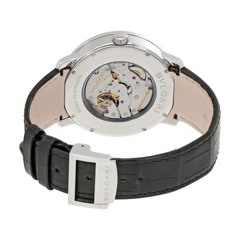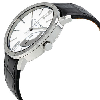 Pre-owned Stainless steel case with a black leather strap. Fixed stainless steel bezel. White dial with silver-tone hands and index hour markers. Arabic numerals mark the 6 and 12 o'clock positions. Dial Type: Analog. Power reserve indicator. Bvlgari Calibre 131 hand wind movement with about 72 Hour of power reserve. Scratch resistant sapphire crystal. Transparent case back. Case size: 43 mm. Round case shape. Deployment clasp. Water resistant at 30 meters / 100 feet. Functions: hour, minute, second, power reserve indicator. Luxury watch style. Watch label: Swiss Made. Item Variations: BB43WSL. Bvlgari Bvlgari Calibro 131 White Dial Men's Watch 101870.