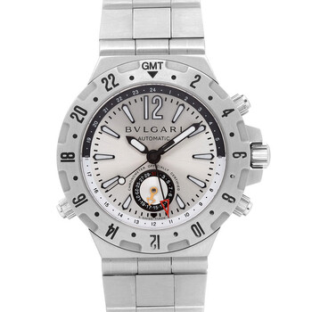 Silver-tone stainless steel case and bracelet. Bi-directional rotating silver-tone stainless steel bezel. Silver-tone dial with black hands and Arabic & index hour markers. Minute markers around the outer rim. Dial Type: Analog. Luminescent hands and markers. Date display at the 6 o'clock position. Date subdials. Automatic movement. Scratch resistant sapphire crystal. Screw down crown. Solid case back. Round case shape, case size: 40 mm, case thickness: 12 mm. Band width: 16 mm, band length: 6.5 inches. Fold over clasp. Water resistant at 30 meters / 100 feet. Functions: date, hour, minute, second. Bvlgari Diagono Professional Series. Casual watch style. Watch label: Swiss Made. Pre-owned Bvlgari Bvlgari Diagono Professional Automatic Silver Dial Men's Watch GMT40S.