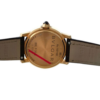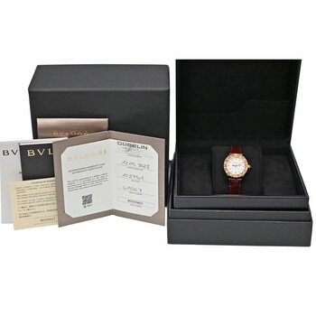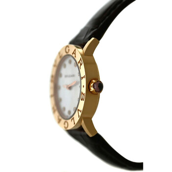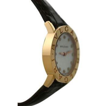 Rose gold-tone 18kt rose gold case with a brown leather strap. Fixed rose gold-tone 18kt rose gold bezel. Mother of pearl dial with rose gold-tone hands and diamond hour markers. Dial Type: Analog. Quartz movement. Scratch resistant sapphire crystal. Pull / push crown. Solid case back. Round case shape, case size: 26 mm. Band length: 6.75 inches. Buckle clasp. Water resistant at 30 meters / 100 feet. Functions: hour, minute. Bvlgari Series. Luxury watch style. Watch label: Swiss Made. Item Variations: BBLP26G. Pre-owned Bvlgari Bvlgari Quartz Diamond Ladies Watch 102751.