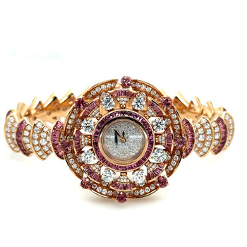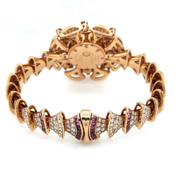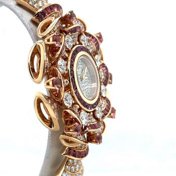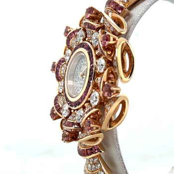 Rose gold-tone 18kt rose gold case and bracelet. Fixed rose gold-tone sapphire bezel. Diamond dial with rose gold-tone hands and diamond hour markers. Dial Type: Analog. Quartz movement. Scratch resistant sapphire crystal. Pull / push crown. Solid case back. Round case shape, case size: 39 mm, case thickness: 6 mm. Band width: 13 mm. Jewelry clasp. Water resistant at 30 meters / 100 feet. Functions: hour, minute. Diva's Dream Series. Luxury watch style. Watch label: Swiss Made. Pre-owned Bvlgari DivaS Dream Quartz Diamond Ladies Watch 102562.