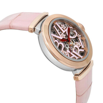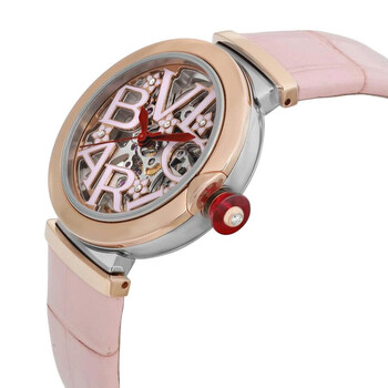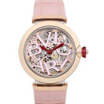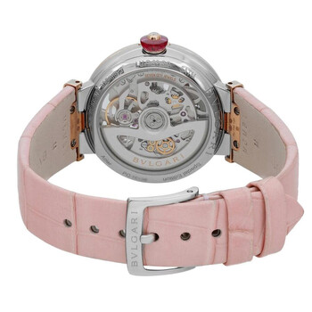 Silver-tone stainless steel case with a pink leather strap. Fixed rose gold-tone 18kt rose gold bezel. Pink dial with red hands. Dial Type: Analog. Bulgari Calibre BVL 191SK automatic movement with a 42-hour power reserve. Transparent case back. Round case shape, case size: 33 mm, case thickness: 10 mm. Band width: 14 mm, band length: 7 inches. Buckle clasp. Water resistant at 30 meters / 100 feet. Functions: hour, minute, second. Lucea Sakura Series. Luxury watch style. Watch label: Swiss Made. Pre-owned Bvlgari Lucea Sakura Automatic Pink Dial Ladies Watch 103108.