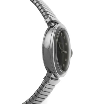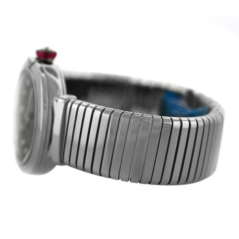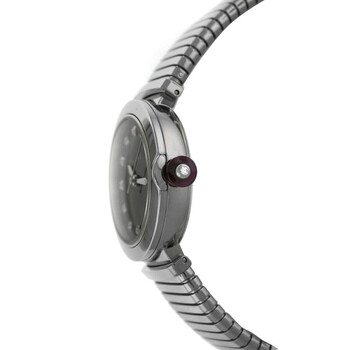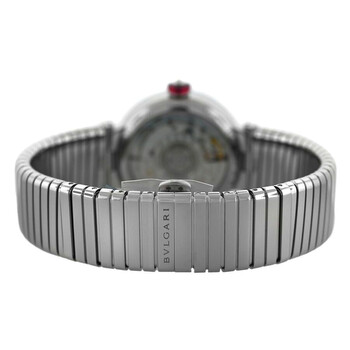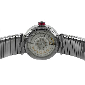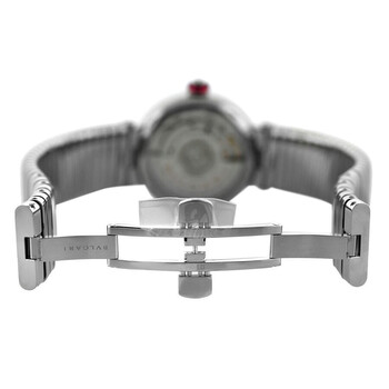 Silver-tone stainless steel case and bracelet. Fixed silver-tone stainless steel bezel. Black dial with silver-tone hands and diamond hour markers. Dial Type: Analog. Date display at the 3 o'clock position. Automatic movement. Scratch resistant sapphire crystal. Pull / push crown. Transparent see through case back. Round case shape, case size: 33 mm. Band length: 6.75 inches. Fold over clasp with a safety release. Water resistant at 50 meters / 165 feet. Functions: date, hour, minute, second. Lvcea Series. Luxury watch style. Watch label: Swiss Made. Item Variations: LU33S, "LU33WSSD/11.T. Pre-owned Bvlgari Lvcea Automatic Diamond Black Dial Ladies Watch 102953.