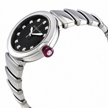 Silver-tone stainless steel case and bracelet. Fixed silver-tone stainless steel bezel. Blue guilloche soleil dial with silver-tone hands and diamond hour markers. Dial Type: Analog. Date display at the 3 o'clock position. Automatic movement with a 42-hour power reserve. Scratch resistant sapphire crystal. Pink cabochon crown. Transparent case back. Round case shape, case size: 33 mm. Deployment clasp. Water resistant at 30 meters / 100 feet. Functions: date, hour, minute, second. Additional Info: crown set with a pink cabochon-cut stone and diamond. Lvcea Series. Luxury watch style. Watch label: Swiss Made. Pre-owned Bvlgari Lvcea Automatic Diamond Ladies Watch 102564.