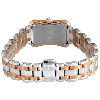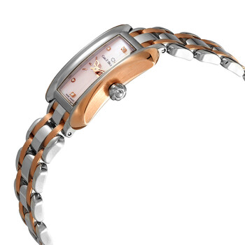 Pre-owned 18kt rose gold case with a stainless steel bracelet with 18kt rose gold links. Fixed stainless steel bezel. White mother of pearl dial with rose gold-tone hands and index and diamond hour markers. Dial Type: Analog. CFB 1850 quartz movement. Scratch resistant sapphire crystal. Pull / push crown. Solid case back. Unique case shape. Case dimensions: 21 mm x 30 mm. Case thickness: 6.2 mm. Band width: 14 mm. Fold over clasp with a safety release. Water resistant at 30 meters / 100 feet. Functions: hour, minute. Alacria Princess Series. Luxury watch style. Watch label: Swiss Made. Carl F. Bucherer Alacria Princess Quartz Diamond White Mother of Pearl Dial Watch 00.10703.07.77.21.