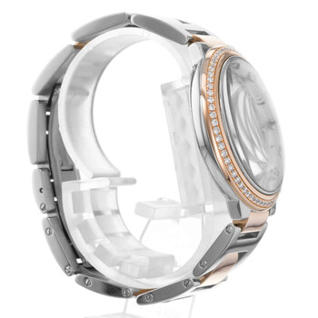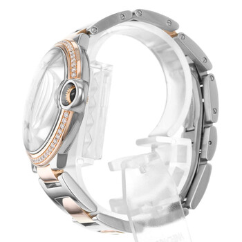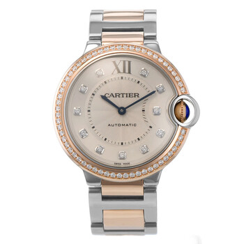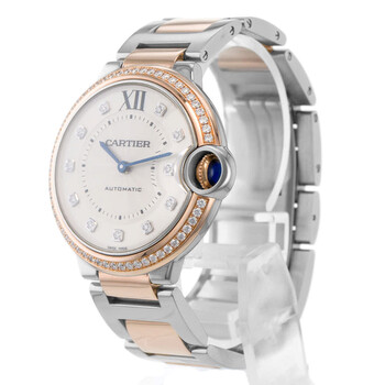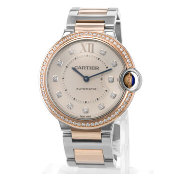 Silver-tone stainless steel case with a two-tone (silver-tone and rose gold-tone) stainless steel and 18kt rose gold bracelet. Fixed rose gold-tone bezel with diamond set 18kt rose gold. Silver-tone dial with blued-steel sword-shaped hands and diamond hour markers. Minute scale around the inner rim. Dial Type: Analog. Cartier Calibre 076 Automatic movement, based upon ETA 2670, containing 25 Jewels, bitting at 28800 vph, and has a power reserve of approximately 38 hours. Scratch resistant sapphire crystal. Cabochon crown. Solid case back. Round case shape, case size: 36 mm. Fold over clasp with a safety release. Water resistant at 30 meters / 100 feet. Functions: hour, minute. Ballon Bleu 36 Series. Luxury watch style. Watch label: Swiss Made. Item Variations: 3754. Pre-owned Cartier Ballon Bleu 36 Automatic Diamond Silver Dial Ladies Watch WE902078.