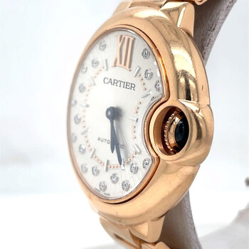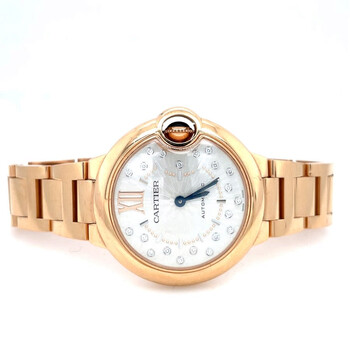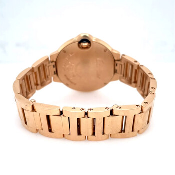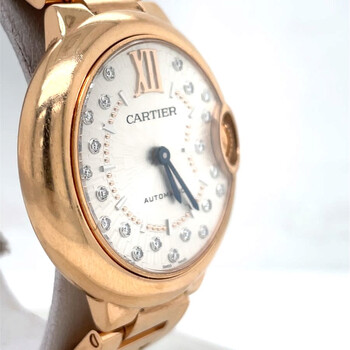 Rose gold-tone 18kt rose gold case and bracelet. Fixed rose gold-tone 18kt rose gold bezel. Silver-tone dial with blued-steel sword-shaped hands and Roman numeral hour markers. Minute scale around the inner rim. Dial Type: Analog. Automatic movement. Scratch resistant sapphire crystal. Pull / push crown. Solid case back. Round case shape, case size: 33 mm, case thickness: 10 mm. Band width: 13.7 mm. Hidden clasp. Water resistant at 30 meters / 100 feet. Functions: hour, minute. Ballon Bleu Series. Luxury watch style. Watch label: Swiss Made. Pre-owned Cartier Ballon Bleu Automatic Silver Dial Ladies Watch WGBB0054.