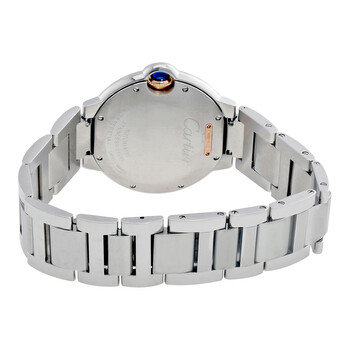 Silver-tone stainless steel case and bracelet. Fixed rose gold bezel with diamond set. Silver dial with blue hands and black Roman numeral hour markers. Minute markers around the inner ring. Dial Type: Analog. Cartier Calibre 076 Automatic movement, based upon ETA 2670, containing 25 Jewels, bitting at 28800 vph, and has a power reserve of approximately 38 hours. Scratch resistant sapphire crystal. Synthetic cabochon-shaped spinel crown. Solid case back. Round case shape, case size: 36 mm, case thickness: 12 mm. Fold over clasp. Water resistant at 30 meters / 100 feet. Functions: hour, minute, second. Ballon Bleu De Cartier Series. Luxury watch style. Watch label: Swiss Made. Pre-owned Cartier Ballon Bleu de Cartier Automatic Diamond Ladies Watch.