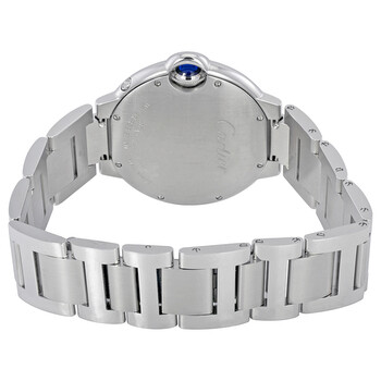 Silver-tone stainless steel case and bracelet. Fixed silver-tone stainless steel bezel. Silver dial with blued-steel sword-shaped hands and Roman numeral hour markers. Dial Type: Analog. One subdial displaying: moonphase. Automatic movement. Scratch resistant sapphire crystal. Solid case back. Round case shape, case size: 37 mm, case thickness: 13 mm. Triple fold over clasp. Water resistant at 30 meters / 100 feet. Functions: hour, minute, moonphase. Ballon Bleu De Cartier Series. Luxury watch style. Watch label: Swiss Made. Pre-owned Cartier Ballon Bleu de Cartier Automatic Silver Dial Ladies Watch WSBB0021. Box: No ,Paper: No