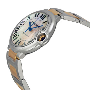 Silver-tone stainless steel case with a silver-tone stainless steel with 18kt rose gold bracelet. Fixed silver-tone stainless steel bezel. Pink mother of pearl dial with blued-steel sword-shaped hands and Roman numeral hour markers. Minute markers around an inner ring. Dial Type: Analog. Cartier Calibre 076 Automatic movement, based upon ETA 2670, containing 25 Jewels, bitting at 28800 vph, and has a power reserve of approximately 38 hours. Scratch resistant sapphire crystal. 18kt rose gold with synthetic spinal cabochon crown. Solid case back. Round case shape, case size: 36.6 mm, case thickness: 12.05 mm. Band width: 18 mm, band length: 6 1/2 inches. Deployment clasp. Water resistant at 30 meters / 100 feet. Functions: hour, minute, second. Ballon Bleu De Cartier Series. Luxury watch style. Watch label: Swiss Made. Pre-owned Cartier Ballon Bleu de Cartier Automatic Unisex Watch W6920033.