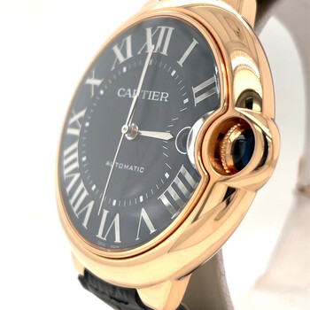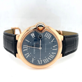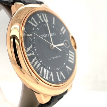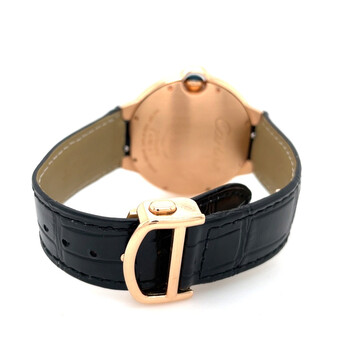 Rose gold-tone 18kt rose gold case with a black leather strap. Fixed rose gold-tone 18kt rose gold bezel. Blue dial with silver-tone hands and Roman numeral hour markers. Minute markers around an inner ring. Dial Type: Analog. Date display at the 3 o'clock position. Cartier Calibre 1847 MC Automatic movement, containing 23 Jewels, bitting at 28800 vph, and has a power reserve of approximately 42 hours. Scratch resistant sapphire crystal. Pull / push crown. Solid case back. Round case shape, case size: 42 mm, case thickness: 13 mm. Band width: 20 mm. Deployment with push button release clasp. Water resistant at 30 meters / 100 feet. Functions: date, hour, minute, second. Ballon Bleu De Cartier Series. Luxury watch style. Watch label: Swiss Made. Pre-owned Cartier Ballon Bleu de Cartier Blue Dial Men's Watch WGBB0036.