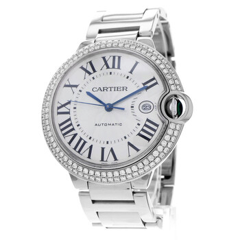 Pre-owned 18kt white gold case with a 18kt white gold bracelet. Fixed 18kt white gold set with diamonds bezel. Silver dial with blue hands and Roman numeral hour markers. Minute markers around an inner ring. Dial Type: Analog. Date display at the 3 o'clock position. Cartier calibre 049 automatic movement, based upon ETA 2892-A2, containing 21 Jewels, bitting at 28800 vph, and has a power reserve of approximately 42 hours. Scratch resistant sapphire crystal. Pull / push set with a synthetic blue cabochon crown. Solid case back. Round case shape. Case size: 42 mm. Case thickness: 11.9 mm. Hidden fold over clasp. Water resistant at 30 meters / 100 feet. Functions: date, hour, minute, second. Ballon Bleu Large Series. Luxury watch style. Watch label: Swiss Made. Cartier Ballon Bleu Silver Dial 18kt White Gold Men's Watch WE9009Z3.