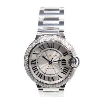 Pre-owned Polished 18kt white gold case with a white gold-tone polished 18kt white gold bracelet. Fixed 18kt white gold diamond set bezel. Silver opaline dial with blued-steel sword-shaped hands and Roman numeral hour markers. Minute markers around the inner ring. Dial Type: Analog. Luminescent hands and dial markers. Cartier Calibre 076 Automatic movement, based upon ETA 2670, containing 25 Jewels, bitting at 28800 vph, and has a power reserve of approximately 38 hours. Scratch resistant sapphire crystal. Fluted gold crown set with blue sapphire cabochon crown. Solid case back. Round case shape, case size: 37 mm, case thickness: 12 mm. 18kt white gold deployment buckle clasp. Water resistant at 30 meters / 100 feet. Functions: hour, minute, second. Ballon Bleu De Cartier Series. Luxury watch style. Watch label: Swiss Made. Cartier Ballon Bleu Medium 18k White Gold Watch WE9006Z3.