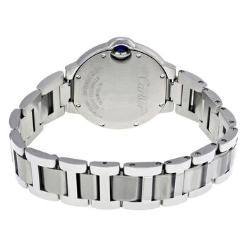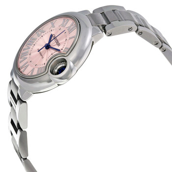 Pre-owned Stainless steel case with a stainless steel bracelet. Fixed stainless steel bezel. Pink dial with blue hands and Roman numeral hour markers. Minute markers around the inner ring. Dial Type: Analog. Automatic movement. Scratch resistant sapphire crystal. Pull / push crown. Solid case back. Case diameter: 33 mm. Case thickness: 9.96 mm. Round case shape. Hidden fold over clasp. Water resistant at 30 meters / 100 feet. Functions: hour, minute, second. Luxury watch style. Watch label: Swiss Made. Cartier Ballon Bleu Pink Dial Stainless Steel Automatic Ladies Watch W6920100.