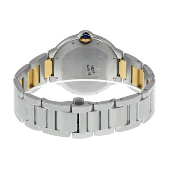 Pre-owned Stainless steel case with a stainless steel bracelet with 18kt yellow gold links. Fixed stainless steel bezel. Silver dial with blue hands and Roman numeral hour markers. Markers around an inner ring. Dial Type: Analog. Date display at the 3 o'clock position. Cartier calibre 049 automatic movement with a 42-hour power reserve. Scratch resistant sapphire crystal. Fluted crown set with synthetic blue cabochon. Solid case back. Round case shape. Case size: 42 mm. Case thickness: 12 mm. Band width: 22.9 mm. Band length: 9 inches. Hidden deployment clasp. Water resistant at 30 meters / 100 feet. Functions: date, hour, minute, second. Additional Info: fluted crown set with synthetic blue cabochon-shaped spinel. Luxury watch style. Watch label: Swiss Made. Cartier Ballon Bleu Silver Dial Men's Watch W69009Z3.