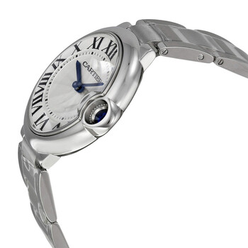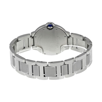 Pre-owned Stainless steel case with a stainless steel bracelet. Fixed stainless steel bezel. Silvered guilloche dial with blued-steel sword-shaped hands and Roman numeral hour markers. Minute markers on a inner ring. Dial Type: Analog. Luminescent hands and dial markers. Quartz movement. Scratch resistant sapphire crystal. Fluted crown set with a synthetic cabochon-shaped spinel crystal. Solid case back. Case diameter: 36.6 mm. Case thickness: 12.05 mm. Round case shape. Band width: 18 mm. Band length: 6.5 inches. Deployment clasp. Water resistant at 30 meters / 100 feet. Functions: hour, minute, second. Additional Info: withstands rain and splashes of water, but not showering or submersion. Luxury watch style. Watch label: Swiss Made. Cartier Ballon Bleu de Cartier Silver Guilloche Stainless Steel Unisex Dial W69011Z4.