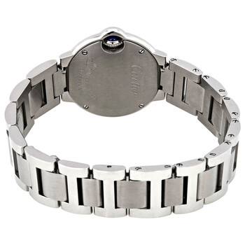 Stainless steel case with a stainless steel bracelet. Fixed stainless steel bezel. Silver opaline dial with rose gold-tone hands and black Roman numeral hour hour markers. Minute markers around an inner ring. Dial Type: Analog. Cartier caliber 057 quartz movement. Scratch resistant anti-reflective sapphire crystal. Fluted crown set with a synthetic cabochon. Solid case back. Case size: 29 mm. Case thickness: 10 mm. Round case shape. Band width: 8.3 mm. Deployment clasp. Water resistant at 30 meters / 100 feet. Functions: hours, minutes. Luxury watch style. Watch label: Swiss Made. Cartier Ballon Bleu Silver Dial Stainless Steel Ladies Watch W69010Z4.