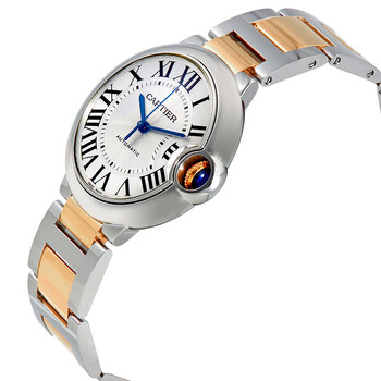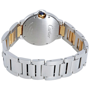 Pre-owned Stainless steel case with a stainless steel bracelet with 18kt yellow gold center links. Fixed stainless steel bezel. Silver dial with blue hands and Roman numeral hour markers. Minute markers around the inner ring. Dial Type: Analog. Automatic movement. Scratch resistant sapphire crystal. Pull / push crown. Solid case back. Case size: 36 mm. Case thickness: 12 mm. Round case shape. Band width: 20 mm. Deployment clasp. Water resistant at 30 meters / 100 feet. Functions: hour, minute, second. Luxury watch style. Watch label: Swiss Made. Cartier Ballon Bleu Automatic Silver Dial Unisex Watch W2BB0012.