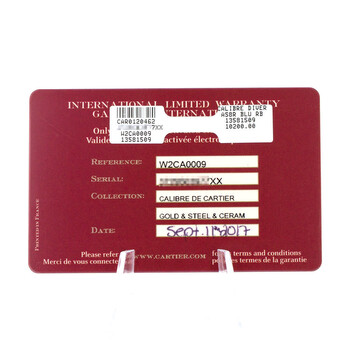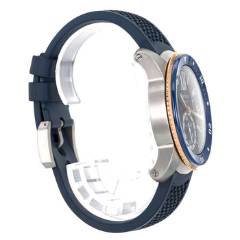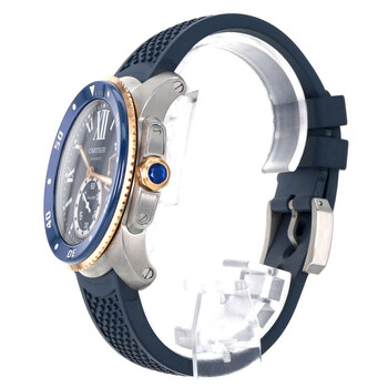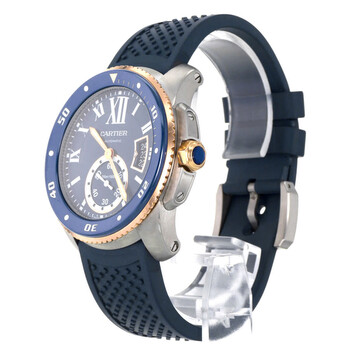 Silver-tone stainless steel case with a blue rubber strap. Uni-directional rotating 18kt rose gold bezel. Blue dial with rose gold-tone hands and Roman numeral hour markers. Minute markers around the outer rim. Dial Type: Analog. Luminescent hands and markers. Date display at the 3 o'clock position. One subdial displaying: small second. Cartier Calibre 1904-PS MC Automatic movement, containing 27 Jewels, bitting at 28800 vph, and has a power reserve of approximately 48 hours. Scratch resistant mineral crystal. Screw down crown. Solid case back. Round case shape, case size: 42 mm. Buckle clasp. Water resistant at 300 meters / 1000 feet. Functions: date, hour, minute, small second. Calibre De Cartier Series. Dive watch style. Watch label: Swiss Made. Item Variations: 3729. Pre-owned Cartier Calibre De Cartier Automatic Blue Dial Men's Watch W2CA0009.