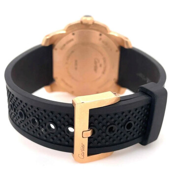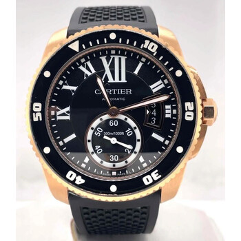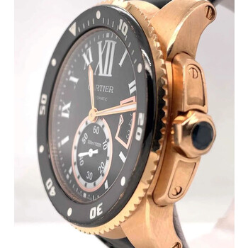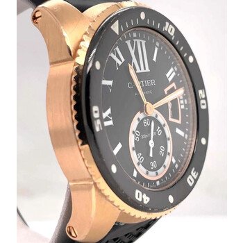 Pre-owned 18kt rose gold case with a black rubber strap. Uni-directional rotating coin edge 18kt rose gold bezel with a black ADLC top ring. Black dial with luminous rose gold-tone sword-shaped hands and index and Roman numeral hour markers. Minute markers around the outer rim. Dial Type: Analog. Luminescent hands and markers. Date display at the 3 o'clock position. Small second sub-dial at the 6 o'clock position. Cartier calibre 1904-PS MC Automatic movement, containing 27 Jewels, bitting at 28800 vph, and has a power reserve of approximately 48 hours. Scratch resistant sapphire crystal. Screw down crown. Solid case back. Round case shape. Case size: 42 mm. Case thickness: 11 mm. Tang clasp. Water resistant at 300 meters / 1000 feet. Functions: date, hour, minute, small second. Calibre De Cartier Diver Series. Dive watch style. Watch label: Swiss Made. Cartier Calibre de Cartier Diver Automatic Men's Watch W7100052.