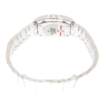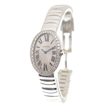 Pre-owned Polished 18k white gold case with a polished 18k white gold bracelet. 18k white gold with diamonds bezel. Silvered with a sun-like finish dial with sword-shaped blue steel hands and Roman hour markers. Quartz movement. Scratch resistant sapphire crystal. 18k white gold octagonal set with 1 diamond crown. Case diameter: 31.6mm x 24.5mm. Case thickness: 8.2mm. Deployment buckle clasp. Water resistant at 30 meters (100 feet). Cartier Baignoire Ladies Watch WB520006.
