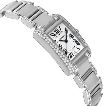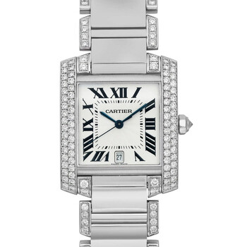 18kt white gold case and bracelet. Fixed bezel with diamond set 18kt white gold. Grey dial with blued-steel sword-shaped hands and Roman numeral hour markers. Minute scale around the inner rim. Dial Type: Analog. Date display at the 6 o'clock position. Automatic movement. Scratch resistant sapphire crystal. Pull / push crown. Solid case back. Rectangle case shape, case size: 28 mm, case thickness: 8 mm. Band width: 19 mm, band length: 6 inches. Hidden clasp. Water resistant at 30 meters / 100 feet. Functions: date, hour, minute, second. Cartier Tank Française Series. Luxury watch style. Watch label: Swiss Made. Pre-owned Cartier Cartier Tank Française Automatic Diamond Grey Dial Unisex Watch WE1003SF.