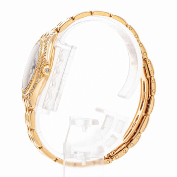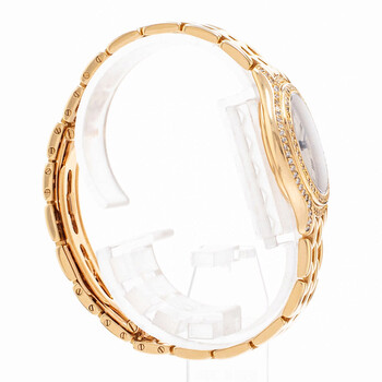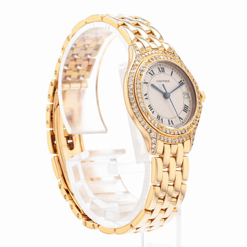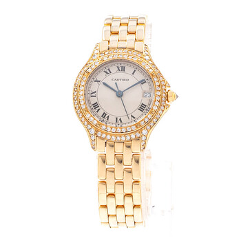 Yellow gold-tone 18kt yellow gold case and bracelet. Fixed yellow gold-tone bezel with diamond set 18kt yellow gold. Silver-tone dial with blued-steel sword-shaped hands and Roman numeral hour markers. Minute markers around the outer rim. Dial Type: Analog. Date display at the 3 o'clock position. Quartz movement. Scratch resistant sapphire crystal. Pull / push crown. Solid case back. Round case shape, case size: 26 mm. Fold over clasp with a safety release. Functions: date, hour, minute, second. Cougar Series. Luxury watch style. Watch label: Swiss Made. Item Variations: 887906. Pre-owned Cartier Cougar Quartz Diamond Silver Dial Ladies Watch W25012B9.