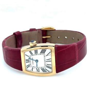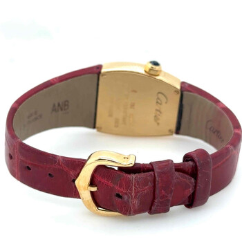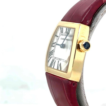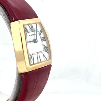 Yellow gold-tone 18kt yellow gold case with a red croco-embossed leather strap. Fixed yellow gold-tone 18kt yellow gold bezel. Silver grained dial with blued-steel sword-shaped hands and Roman numerals hour markers. Minute markers around the inner ring. Dial Type: Analog. Quartz movement. Scratch resistant sapphire crystal. Solid case back. Unique case shape, case size: 33 mm x 28 mm. 18kt yellow gold buckle clasp. Water resistant at 30 meters / 100 feet. Functions: hours, minutes. La Dona Series. Dress watch style. Watch label: Swiss Made. Pre-owned Cartier La Dona Quartz Ladies Watch W6400156.